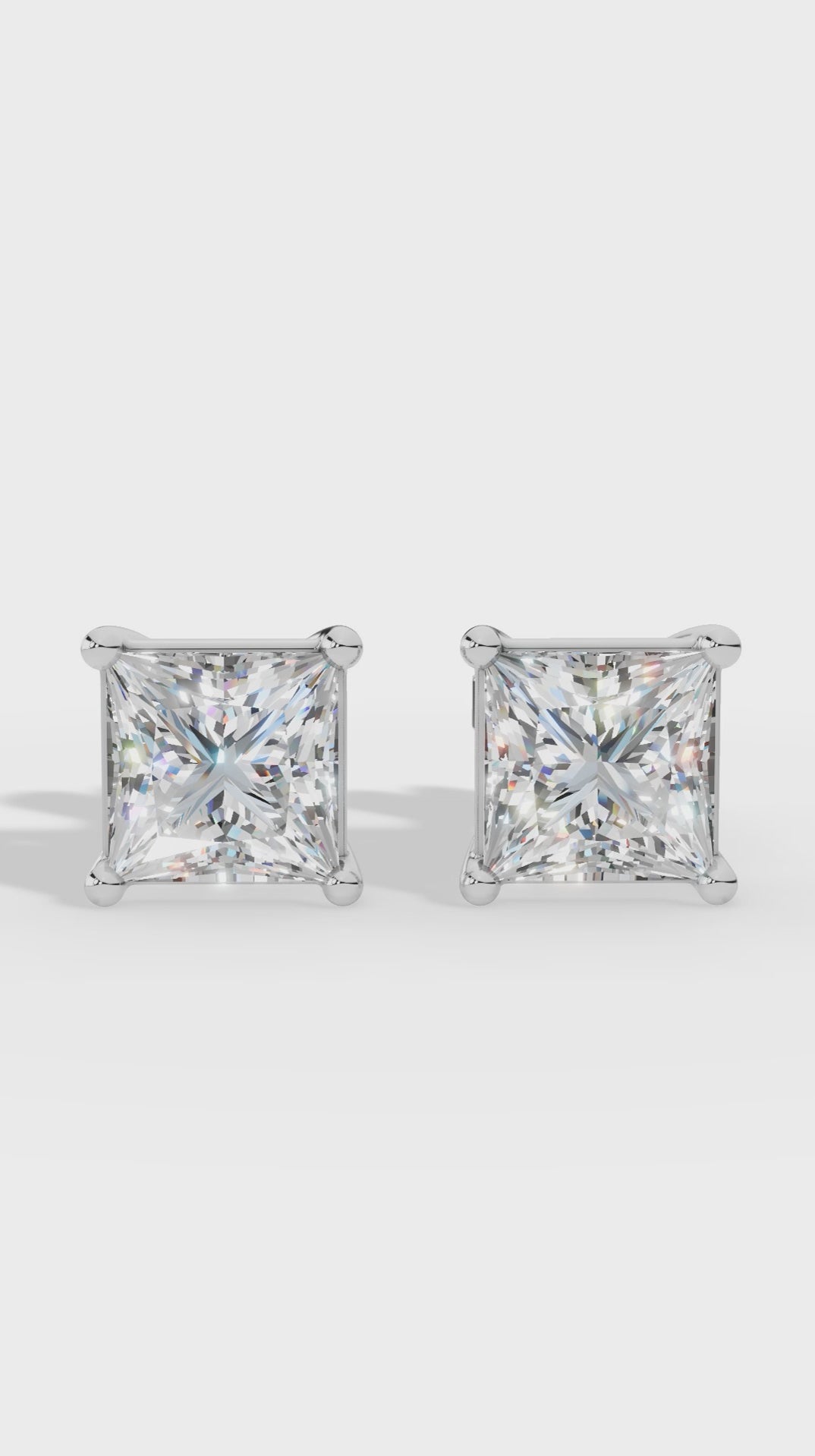 The princess cut solitaire four prong basket stud earrings feature a sharp square stone securely set in a classic four-prong basket, offering brilliant sparkle and timeless elegance.
